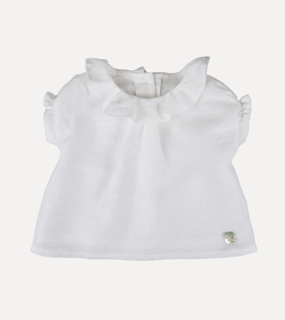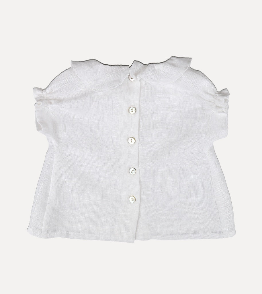 Blusa 100% algodón, en color Blanco de manga corta para niñas de 1 mes a 2 años. Tiene el cuello redondo acabado con un volante alrededor. Las mangas tienen el tejido fruncido y se abrocha por la espalda con unos pequeños botones de nácar