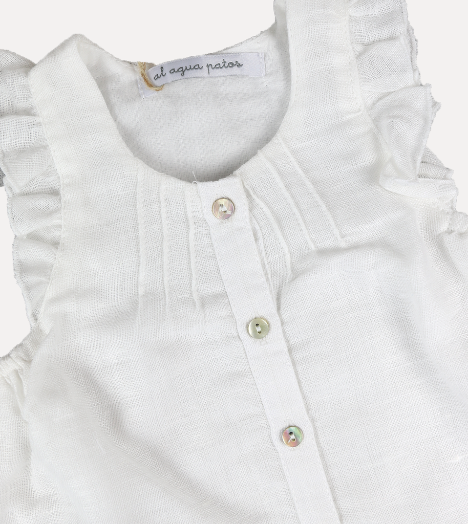 Esta blusa está pensada para las niñas más mayores. En los hombros lleva unos volantitos y se abrocha por delante con unos pequeños botones de nácar. 100% algodón