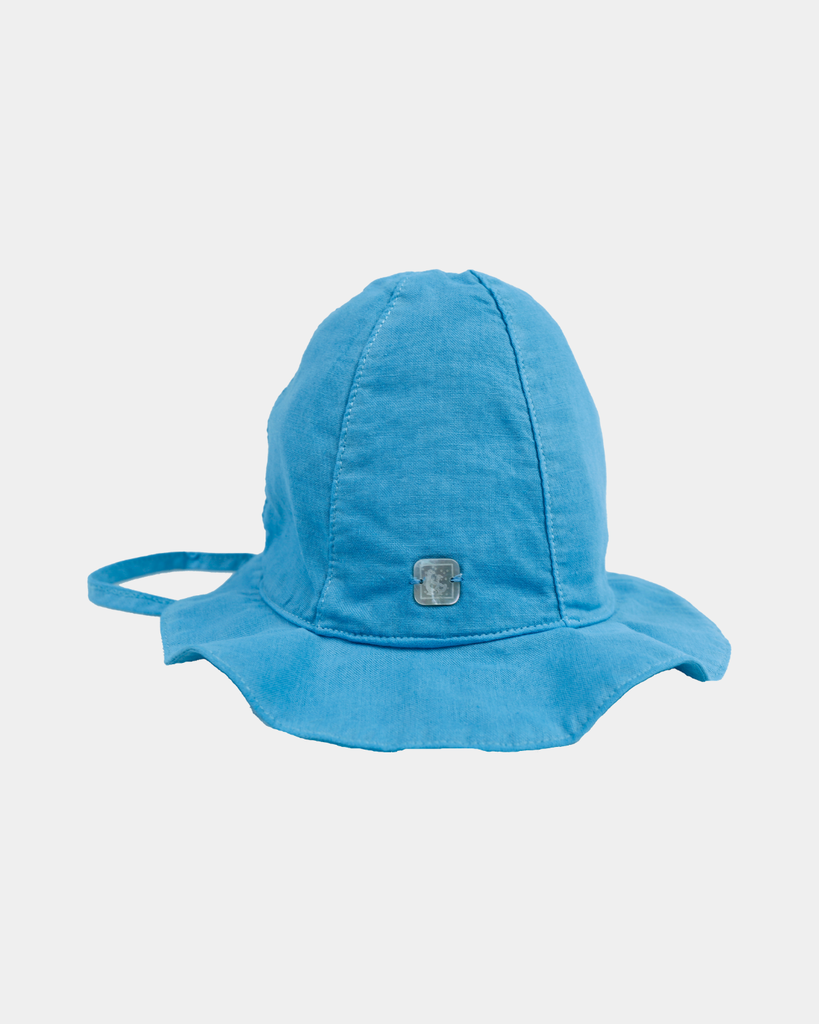 Este sombrerito está confeccionado en tejido de poliamida con un 18% de lycra que le aporta gran confort y facilita su colocación. Tiene un ala ancha para proteger del sol. Dispone de una cinta, también de tejido elástico, para sujetar debajo de la barbilla.