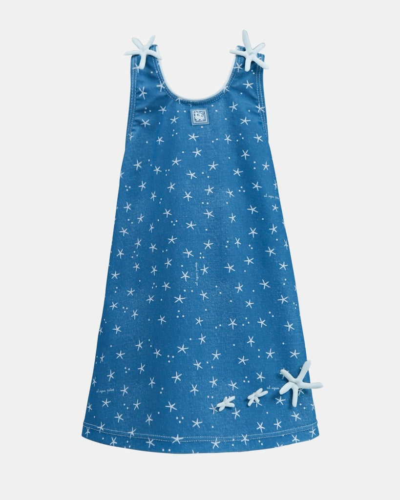 Este vestido está confeccionado en tejido de poliamida con un 18% de licra, esto puede parecer absurdo por que no sirve para bañarse, pero tiene la ventaja de que no se arruga, es cómodo, y al final del verano sus colores están como el primer dí­a.