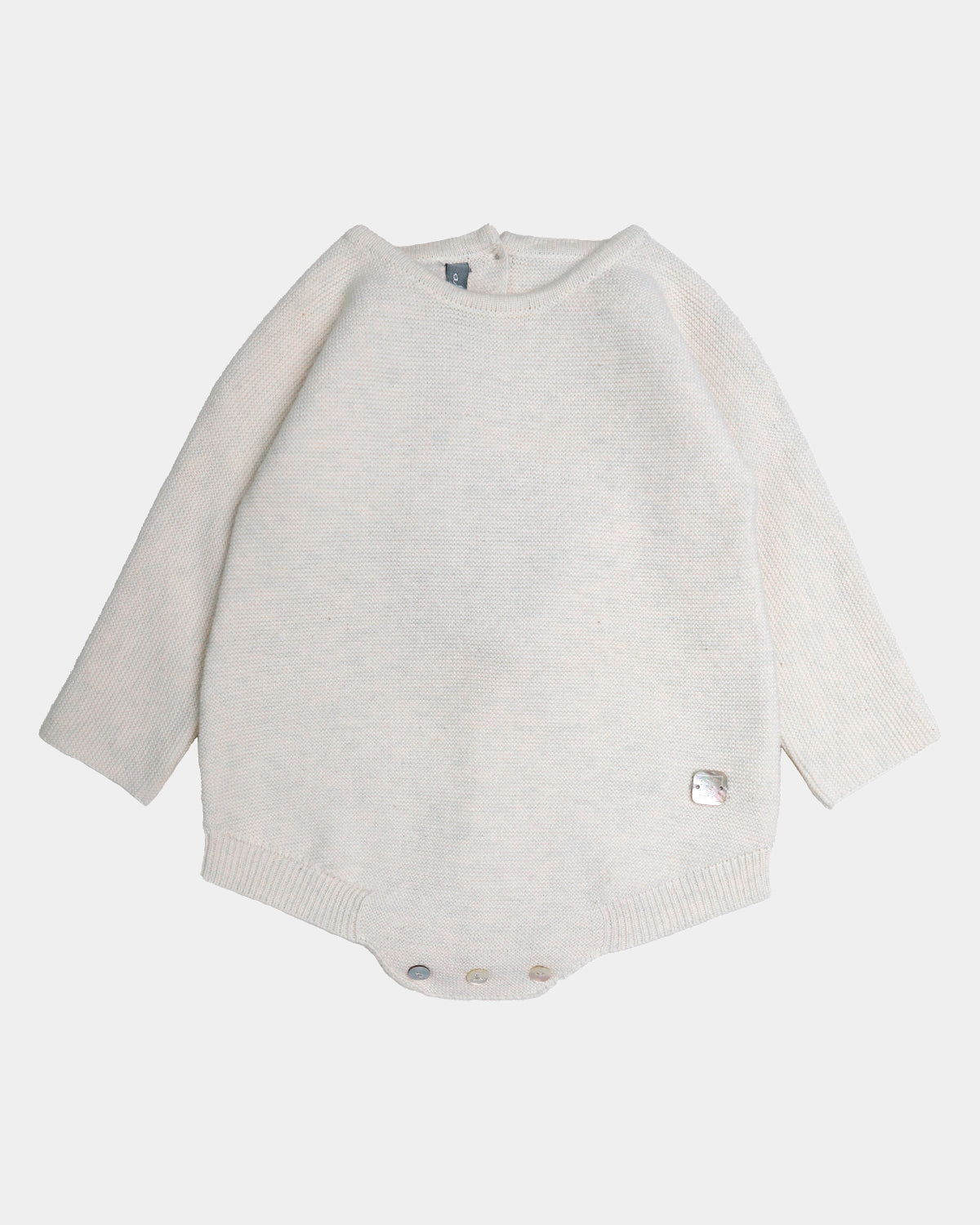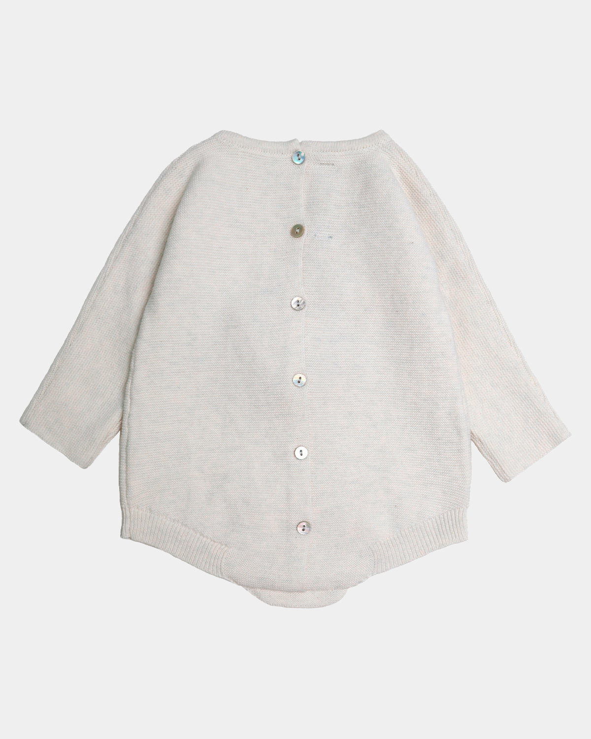 Pelele corto de manga larga, confeccionado en punto liso. Para bebé de 1 a 12 meses. Cierre con botones de nácar a lo largo de toda la espalda, para facilitar la puesta de la prenda y el cambio de pañal.
