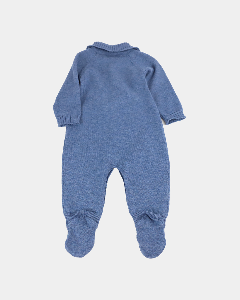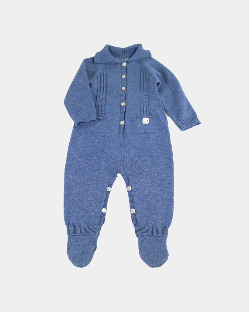 Pelele en punto liso de algodón 100%, abrochado por la parte frontal y los camales. El cuello es de suave canalé. Dos trenzas decoran la pechera hasta los dos diminutos bolsillos.