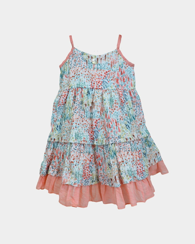 Vestido de niña perfecto para las ocasiones especiales. La falda tiene mucho vuelo y en los laterales y en la espalda el tejido engomado hace que se ajuste a la perfección al cuerpo de las niñas. Los tirantes tienen el tejido ligeramente fruncido y se juntan en la espalda haciendo una forma de V.