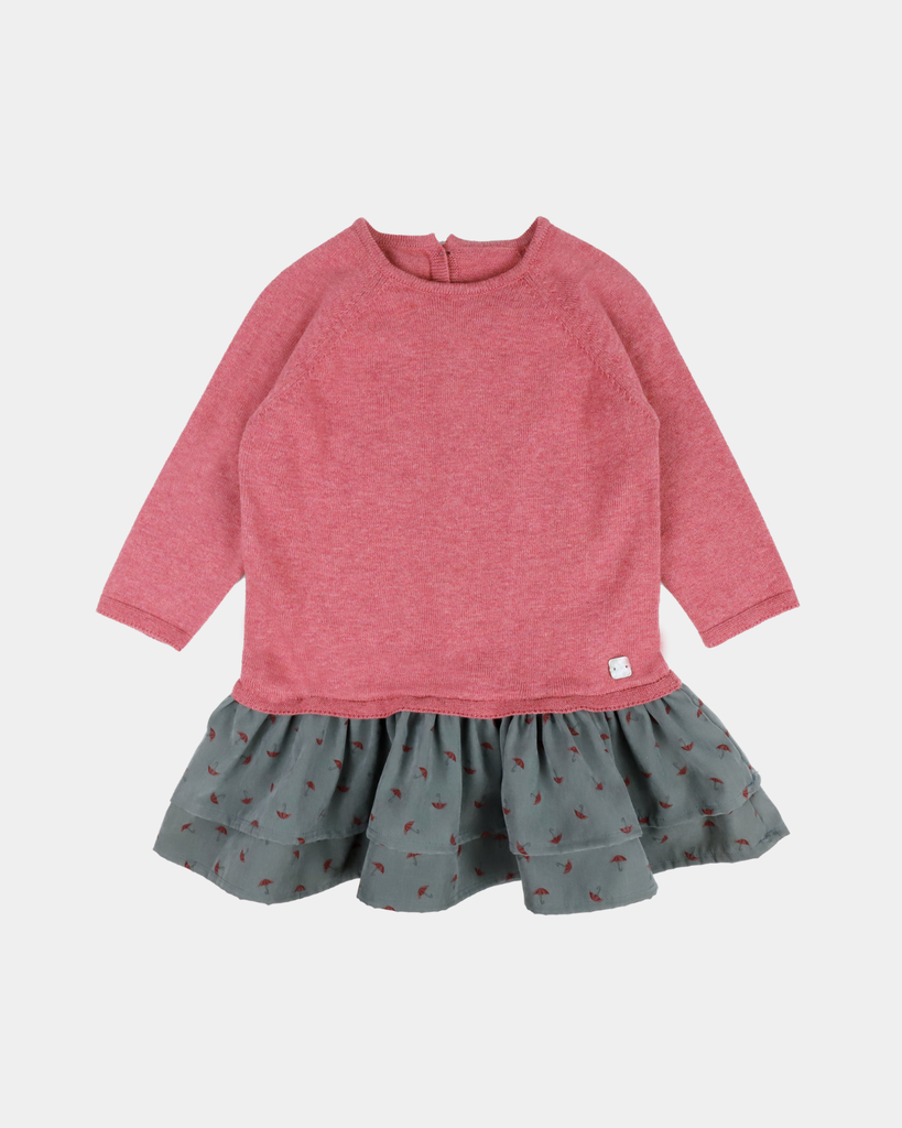 Vestido punto liso en la parte superior y en la parte inferior faldita de cuadros. Abrochado en la espalda. Disponible para niñas entre 3 meses y 10 años. 100% de algodón.
