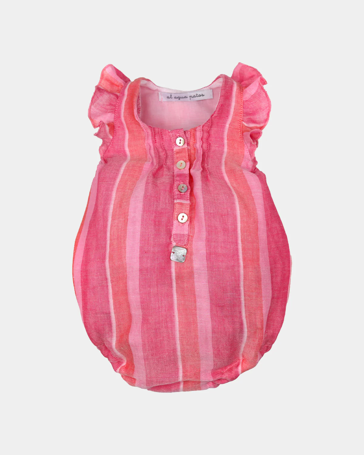 Ranita en tonos rosas y blancos de tirantes para bebé recién nacido de 1 a 24 meses y confeccionado con la tela de la línea Madrás. Se abrocha con unos botoncitos de nácar en el pecho y automáticos en la entrepierna para que cambiar el pañal sea mucho más fácil. Lleva unas gomas muy suaves en los camales que no aprietan.
