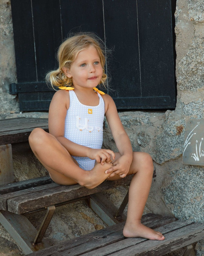 Este Bañador está confeccionado con tejido de poliamida con un 18% de licra que le da gran elasticidad. En los hombros, los lacitos además de anudados van cosidos para evitar que se pierdan. En el pecho lleva bordado el anagrama de nuestra marca: una familia de patitos. Las figuras de esta aplicación tienen un cierto relieve.