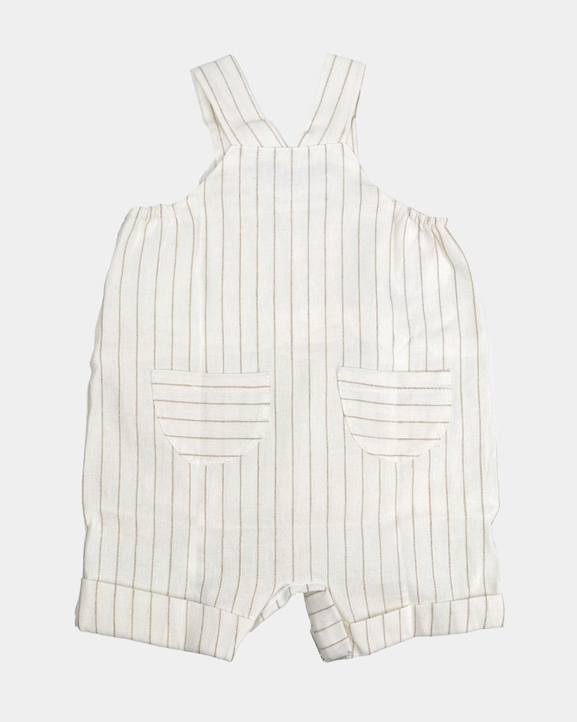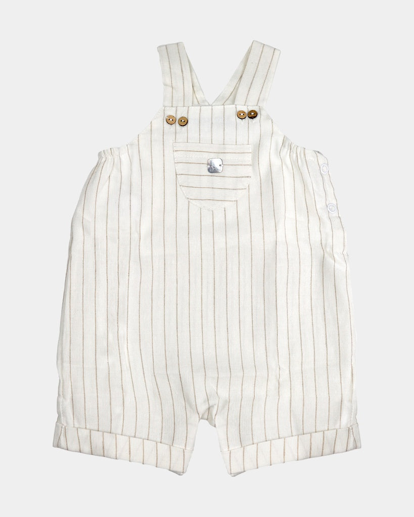 Este pelele campesino en el centro delantero luce un bolsillo de extremos redondeados. El pelele se abrocha por los tirantes por medio de sus botones, por uno de los laterales con botones a presión y por la zona del pañal para que cambiarlo sea facilísimo. El estampado canutillo es un clásico modelo a rayas muy finas.