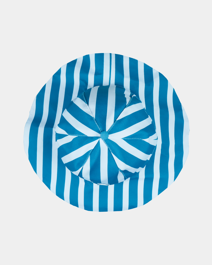 Este elegante sombrerito está confeccionado en tejido de poliamida con un 18% de lycra, con certificado de protección ultravioleta. Además, este tejido aporta elasticidad y facilita la colocación del gorro. Tiene un ala ancha muy elegante y protectora. Dispone de una cinta, también de tejido elástico, para sujetar debajo de la barbilla. El estampado de rayas azul de nuestra serie Listas, es un estampado atemporal y fácil de combinar.