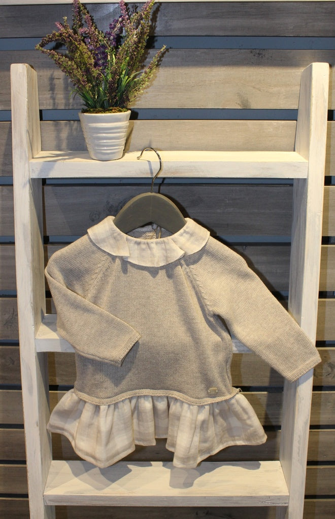 Vestido punto liso en la parte superior y en la parte inferior faldita de cuadros. Abrochado en la espalda. Disponible para niñas entre 3 meses y 10 años. 100% de algodón.