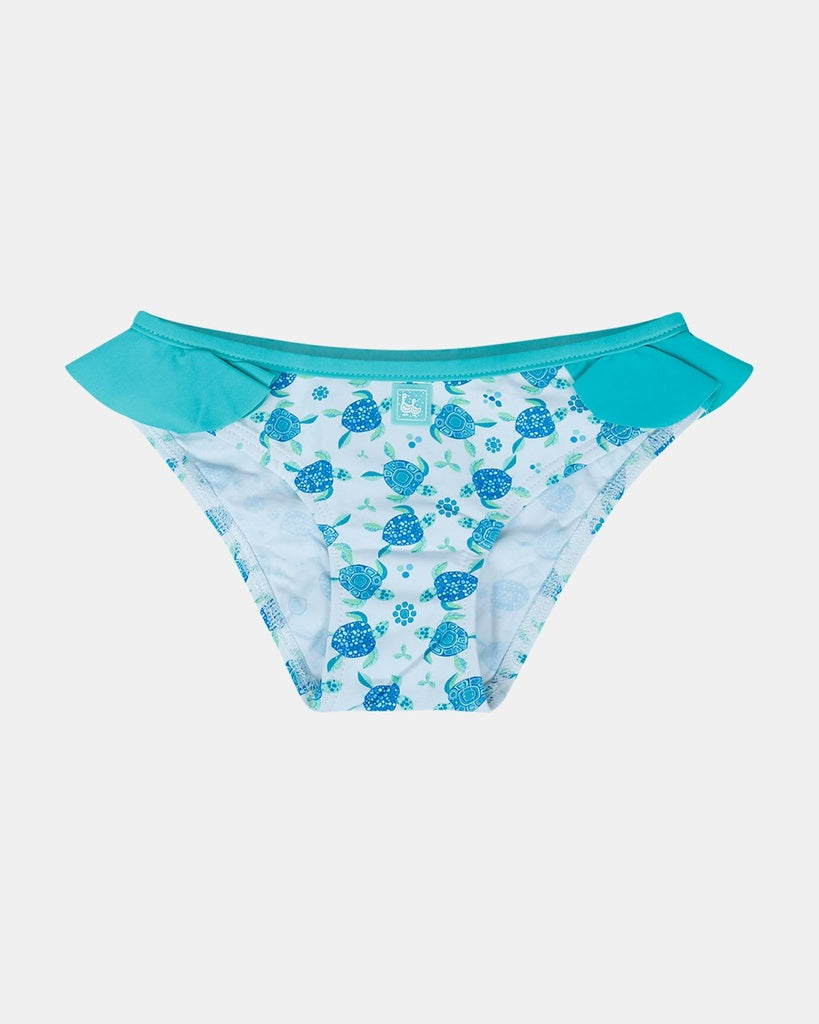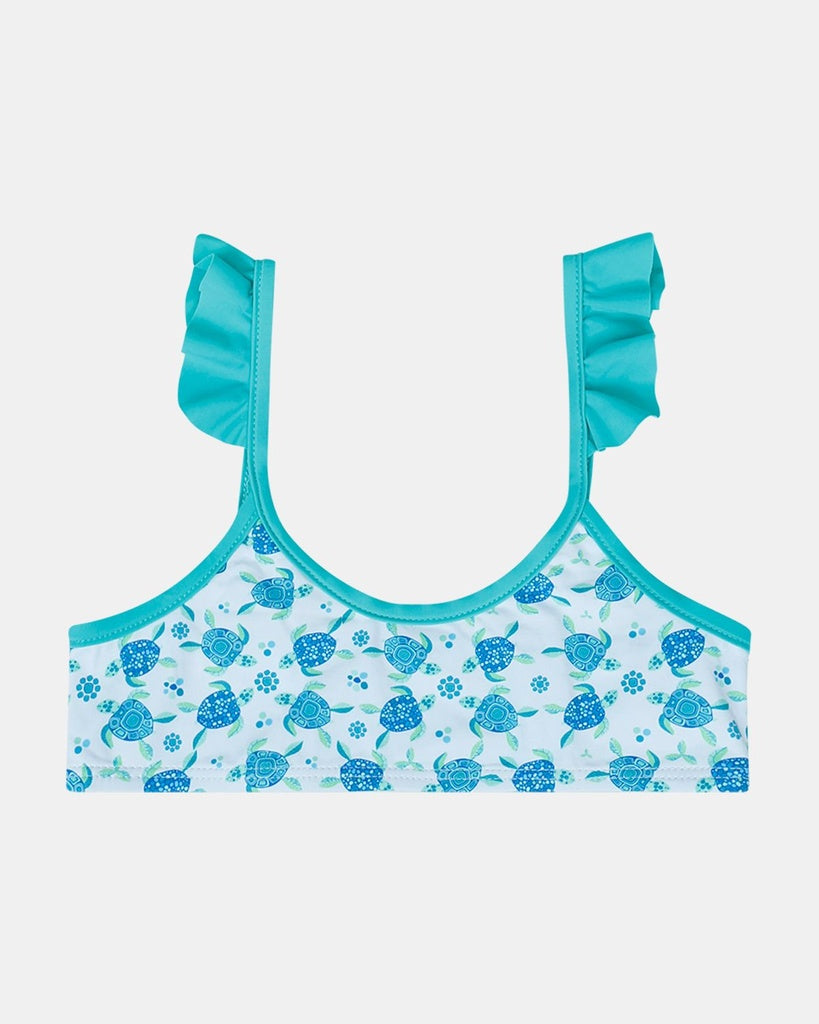 Bikini ideal con el estampado Tortugas Azul. Los tirantes del top llevan entrelazada una guirnalda de flores de licra, que le dan un movimiento muy especial al bikini. La parte de abajo también va rematada con estas flores en los laterales y en la parte trasera dándole movimiento a la prenda.