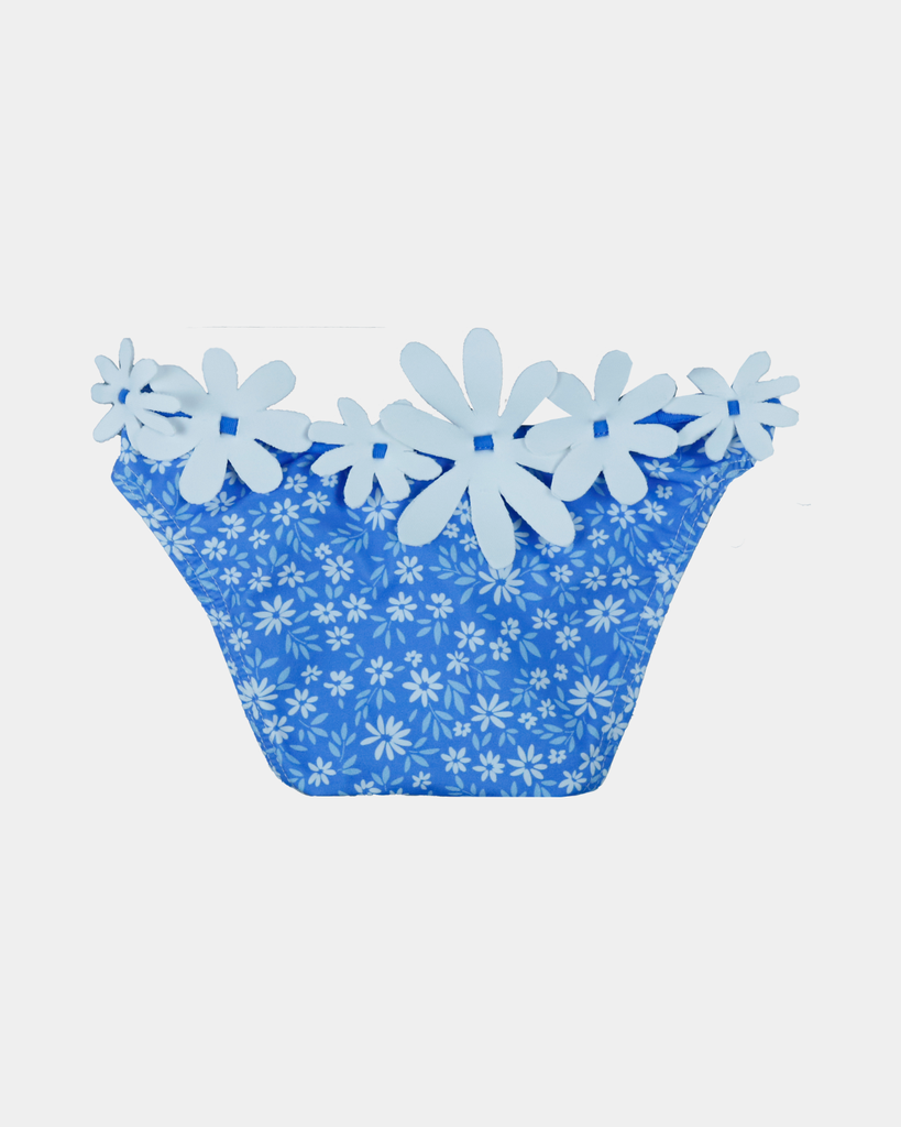 Braguita de baño confeccionada en tejido de poliamida con un 18% de lycra. Con flores de lycra que cubren los laterales y la parte posterior en el estampado Rocí­o. Delante lleva bordado nuestro anagrama formado por una familia de patos. Las figuras de esta aplicación tienen un cierto relieve.