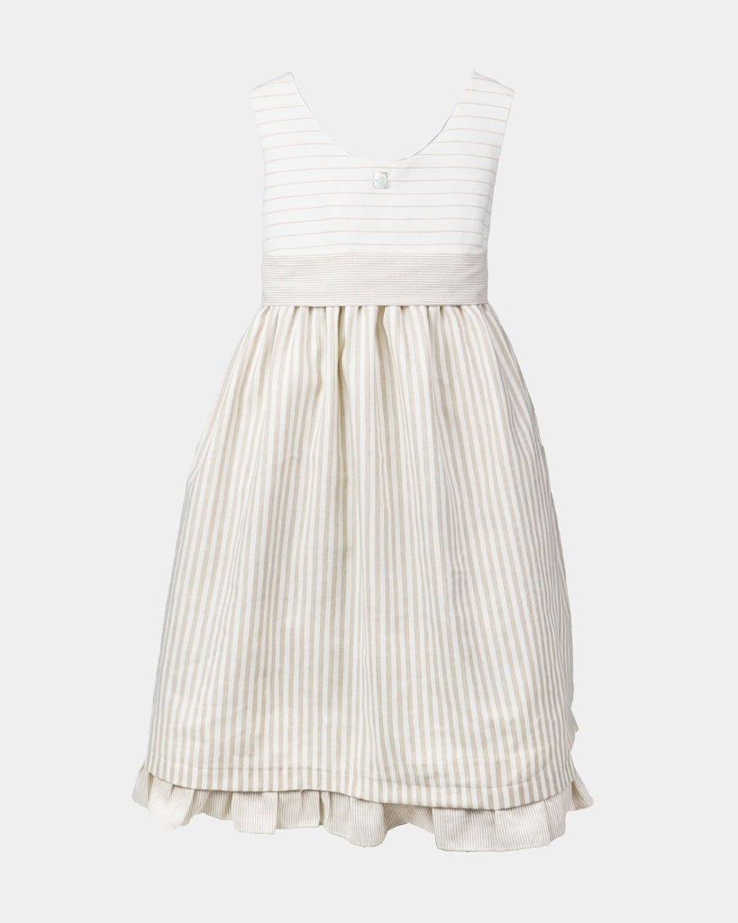 Vestido de niña perfecto para las ocasiones especiales. La falda tiene mucho vuelo y en los laterales y en la espalda el tejido engomado hace que se ajuste a la perfección al cuerpo de las niñas. Los tirantes tienen el tejido ligeramente fruncido y se juntan en la espalda haciendo una forma de V.