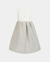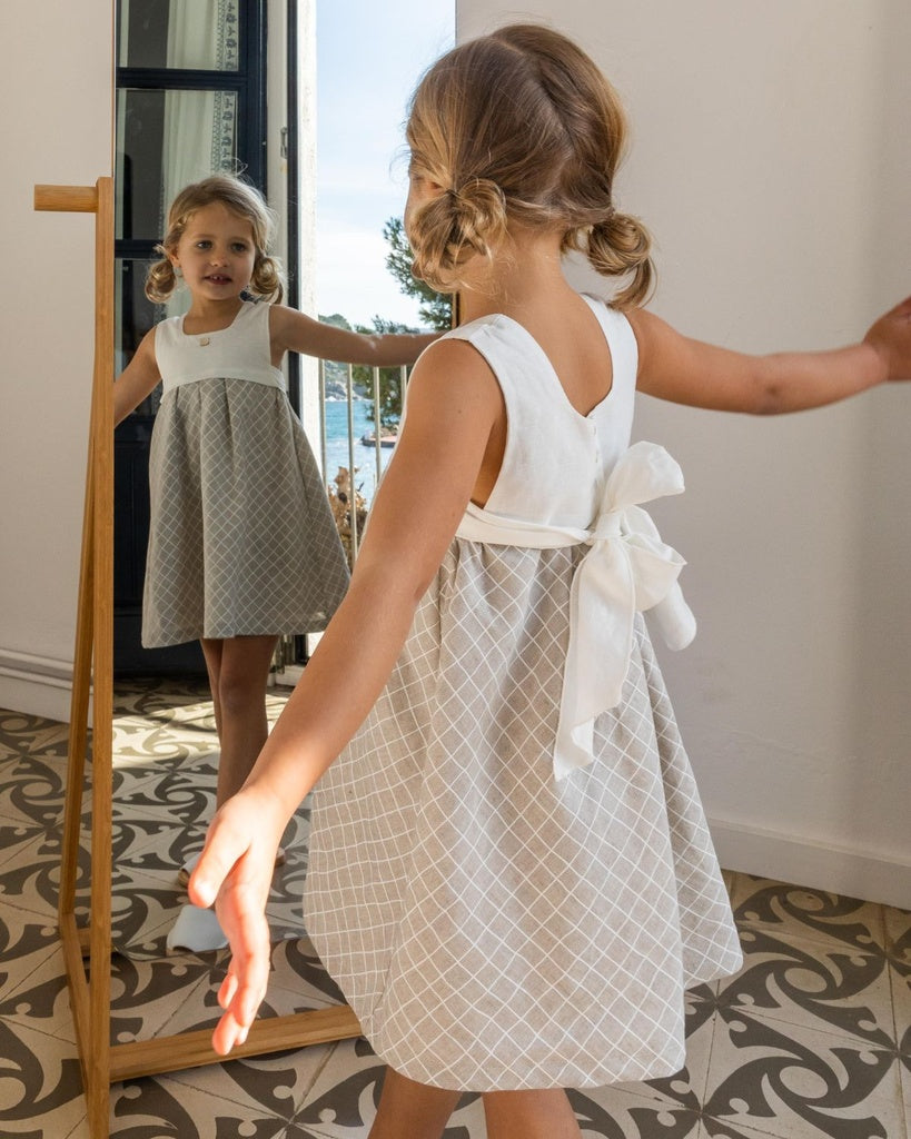 Vestido de niña perfecto para las ocasiones especiales. La falda tiene mucho vuelo y en los laterales y en la espalda el tejido engomado hace que se ajuste a la perfección al cuerpo de las niñas. Los tirantes tienen el tejido ligeramente fruncido y se juntan en la espalda haciendo una forma de V.