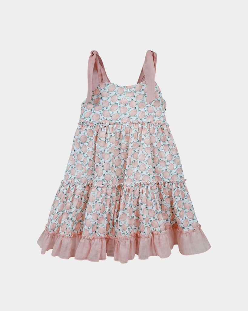 Vestido de niña perfecto para las ocasiones especiales. La falda tiene mucho vuelo y en los laterales y en la espalda el tejido engomado hace que se ajuste a la perfección al cuerpo de las niñas. Los tirantes tienen el tejido ligeramente fruncido y se juntan en la espalda haciendo una forma de V.