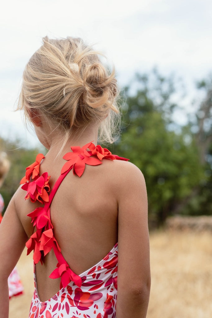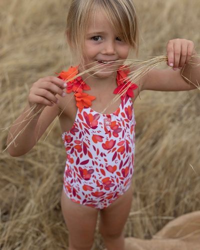 Este bañador está confeccionado con tejido de poliamida con un 18% de licra que le da gran elasticidad. Los tirantes llevan muchas florecitas que hacen a la prenda muy elegante y especial.